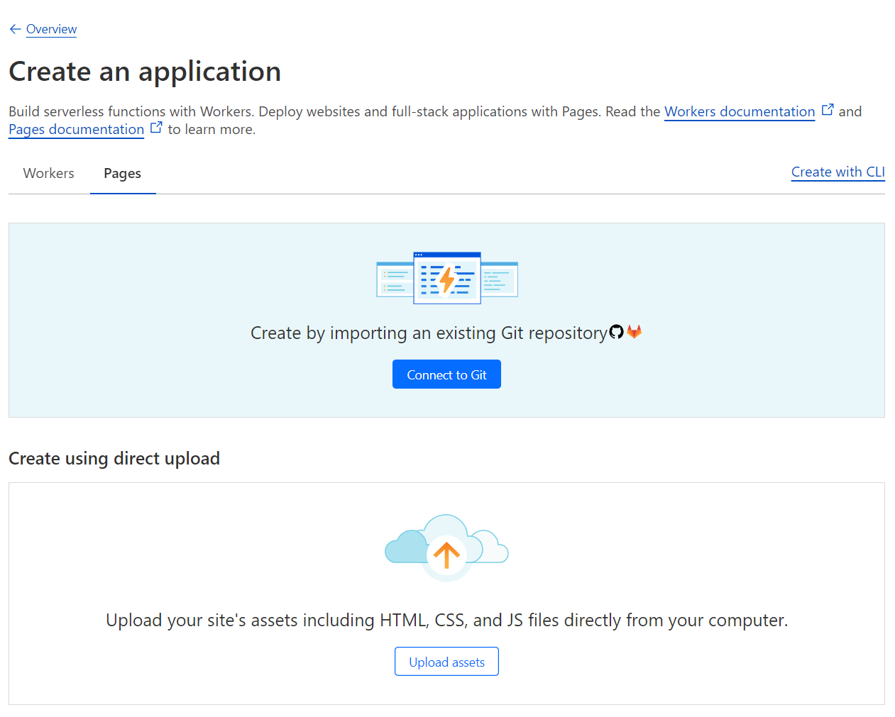 To deploy a website with Pages, we need to connect our Git repository. First click the ‘Create’ button in the overview page, go to the ‘Pages’ tab and select Connect to Git to create a new website.